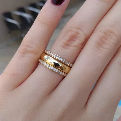 ✔ É tipo específico de anel, geralmente mais fino e discreto, usado para acompanhar ou “aparar” outro anel principal, como uma aliança ou anel de noivado
